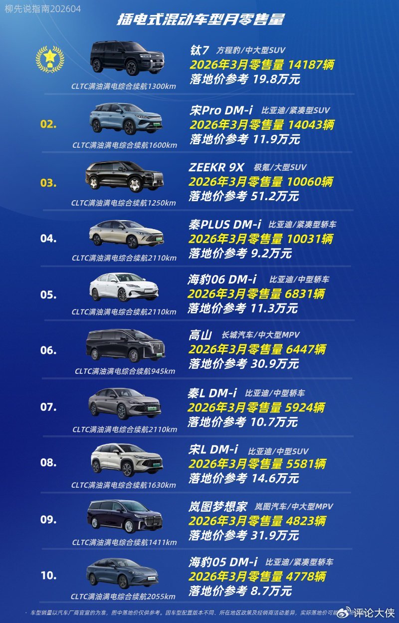 在具体的车型销量表现上,2026年3月的数据同样看点十足。当月共有四款插混车型月零售量突破1万台大关,它们分别是方程豹钛7(配置|询价)、比亚迪宋Pro DM-i、极氪ZEEKR 9X(配置|询价)以及比亚迪宋PLUS(配置|询价) DM-i。