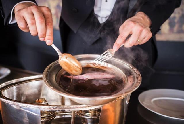 随后,用这些精华与鸭肝、黄油、干邑白兰地一同熬制成酱汁,浇在切片鸭胸上。整套工序往往在餐桌旁进行,实际上就是一场华丽的美食表演。