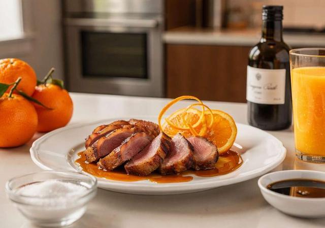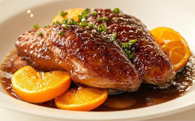 香橙鸭(Canard à l‘Orange)是另一道法式名菜。它的做法是将煎至半熟的鸭胸肉佐以酸甜的橙汁酱,吃的时候能感觉到果香与肉香在口中交织。